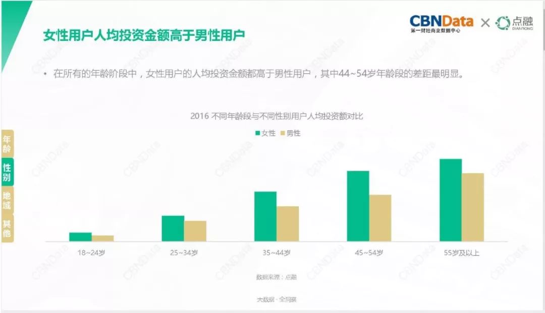 如果这些礼物奉上,丈母娘还是没有面露喜色,那么关键来了,送礼的同时再送上几条理财妙招。CBNData此前发布的《2017新财富时代洞察报告》显示,从绝对人数来看,女性“土豪”用户数量比男性多。且在在所有的年龄段中,女性用户的人均投资金额都高于男性用户,其中44至54岁年龄段的差距最为明显。所以,如果囊中羞涩不能给丈母娘买的开心,那么就开动脑筋帮她赚到飞起!