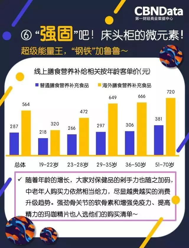 CBNData《2017国民膳食营养相关系列研究》显示,51~70岁的中老年人群不仅购买力度最大,购买频次也是佼佼者。而且线上保健品消费的一个小高峰也明显得益于九月初九重阳节,所以跟着趋势买,出错的概率也会大大减少。
