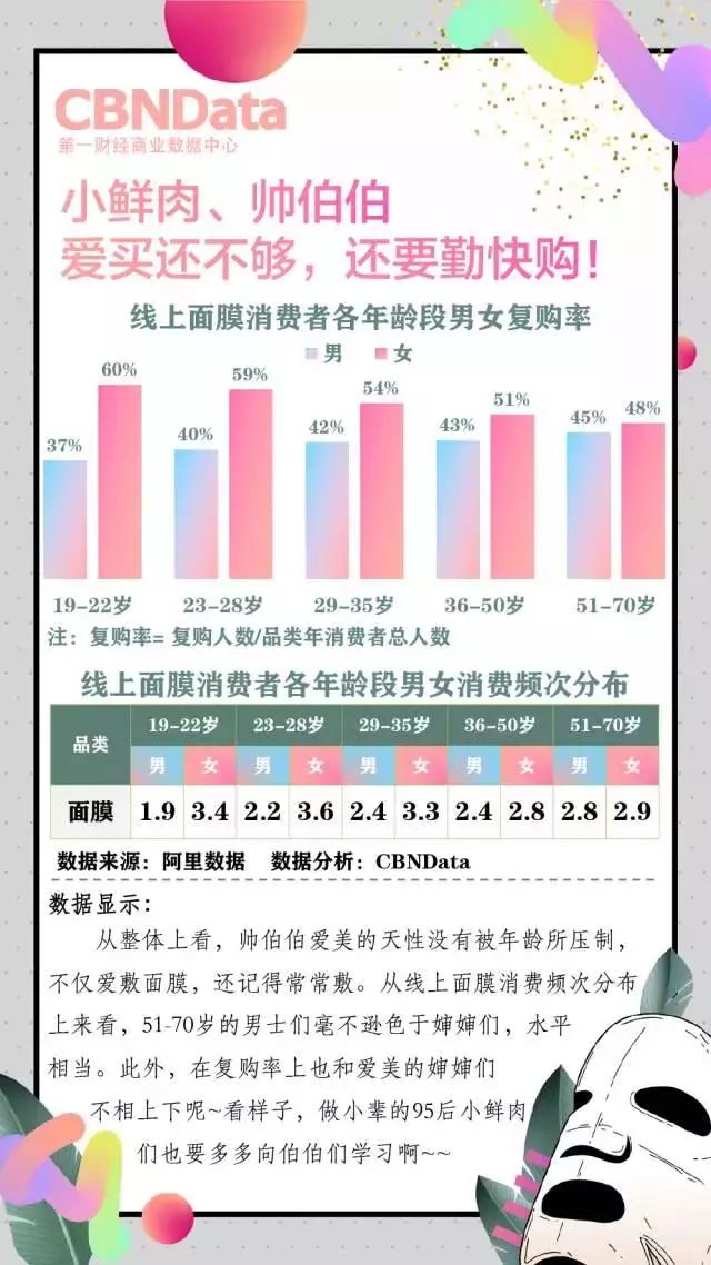 此外,也可以剑走偏锋,出落俗套,为老丈人门购置点美妆用品。觉得不可思议?CBNData此前发布的《2017线上面膜相关消费研究》显示,从线上面膜消费者各年龄段男女复购率和消费频次分布来看,51-70岁的男士们毫不逊色与同年龄段的女士。所以,老丈人们的爱美之心,可能超出你的想象。