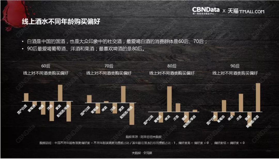 春节一家人凑在一起,喝点酒最是助兴。CBNData携手天猫联合发布的《中国人的酒杯——2017天猫酒水消费大数据报告》显示,60后、70后最爱白酒,80后最爱啤酒,90后最爱喝葡萄酒、洋酒和果酒;按性别来看,男生更爱喝国产白酒、洋酒、啤酒,女生更爱喝葡萄酒、果酒、黄酒。所以,去之前先分析下媳妇儿家的家庭人群年龄结构,对症买酒才能买对口味。