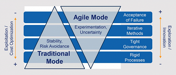 以上两个因素,从技术架构和人员架构两个方面制约了敏捷的大规模推广。所以,银行想要“快”起来,往往不那么容易。各家银行的转型,都会选择相对新的技术领域,或和用户结合比较紧密的应用开始试点。而初期的转型目标,也会设定为“探索在现有约束条件下,如何进行敏捷模式落地”。最终,大多数银行都会走向“双模”:明确哪些系统和应用更看重业务表现的稳定性(采用瀑布模式),哪些更看重市场变化的响应速度(采用敏捷迭代模式)。