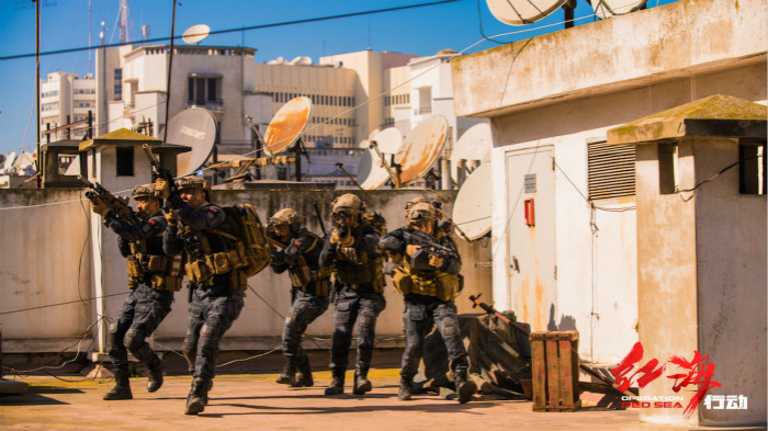 继《战狼》系列表现特种陆军作战能力、《空天猎》表现我国空军战斗实力之后,《红海行动》是第一部表现我国海军能量的影片,聚焦的是需要面对更加复杂的形势的海军陆战队,他们不仅需要在海战中压制住敌人的炮火,也需要登陆上岸,在非洲的沙漠里掩护我国侨胞撤离军事区域。