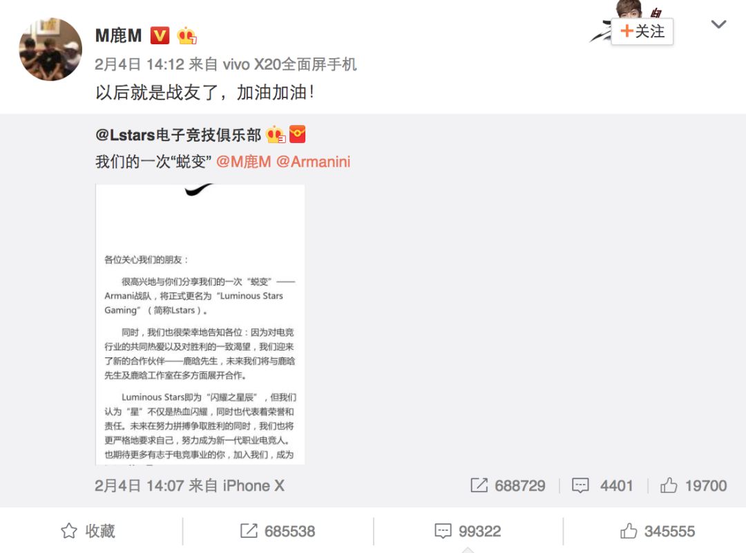 虽然鹿晗更多可能只是扮演出资人和代言人的角色,不会与战队日常经营管理有太多瓜葛,但依旧让很多路人知道了Lstars战队的名字。关于此次合作,Armani战队的微博评论只有4千多条,但鹿晗一转发,就收获了9万评论和68万转发。