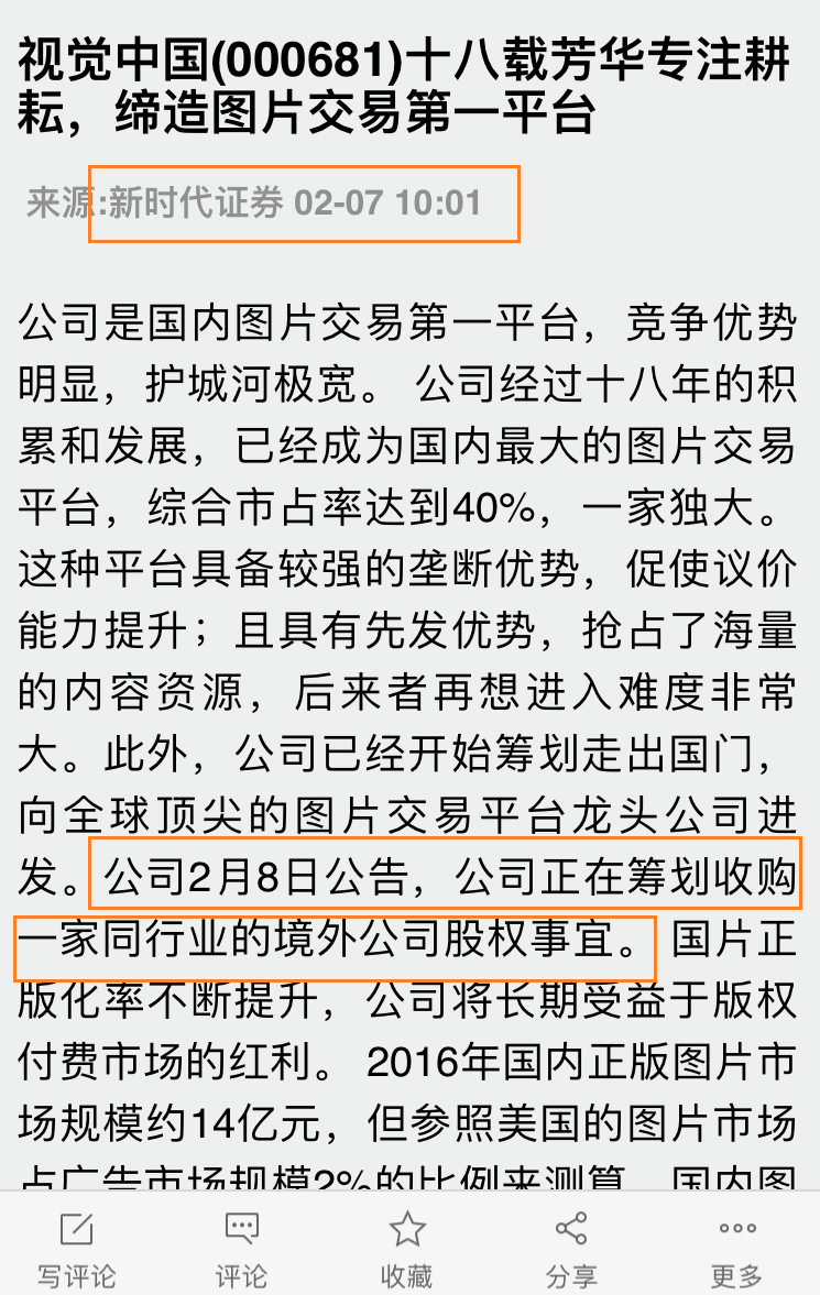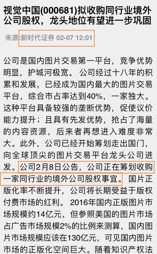 其中,在一篇题为《视觉中国拟收购同行业境外公司股权,龙头地位有望进一步巩固》的公司点评报告中,该分析师“未卜先知”地写道:“公司2月8日公告,公司正在筹划收购一家同行业的境外公司股权事宜。”