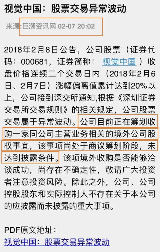 2月8日(实际发布时间为2月7日晚间),连续两个交易日股价逆市大涨的视觉中国对外发布异动公告称,公司目前正在筹划收购一家同公司主营业务相关的境外公司股权事宜,该事项尚处于商议筹划阶段,未达到披露条件。该项境外收购是否能够洽谈成功,尚存在不确定性,敬请广大投资者注意投资风险。公司已针对该事项进行了内幕信息知情人登记工作,将该信息的知情者控制在最小范围内。