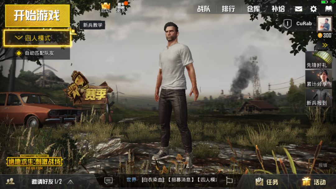 角色创建完成后来到主界面,《刺激战场》的主界面布局依然是和《绝地求生》十分相似,左边功能区选择游戏模式;排行榜、个人信息等被摆放在画面上方,整体色调如出一辙,区别在于画面背景略有不同,但标志性左侧轿车和右侧黑烟得到还原。