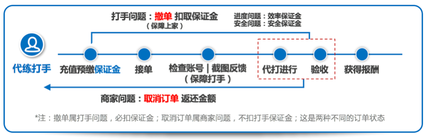 代练平台一般向打手收取两种保证金,分别为效率保证金和安全保证金,前者针对代练过程中的安全事故(涉及账号信息的问题),后者则针对代练过程中的效率事故(涉及代练时间的问题)。下图是打手常见的工作流程和平台的押金模式。