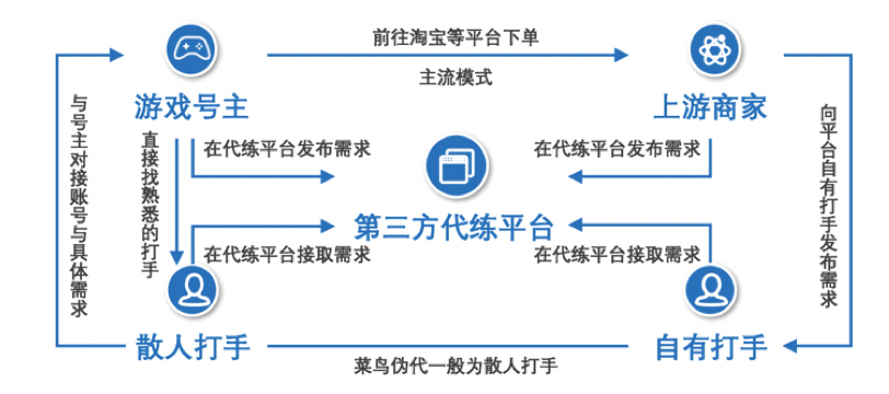 代练的雏形是基于朋友情谊的帮忙,商业代练的雏形是用货币或物品交换的方式来进行代练,商业代练产业的雏形是由于越来越多的人产生需求,开始形成规模产业。