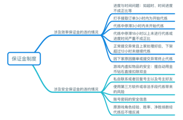 商家可自己制定要求和规则,违反要求则扣除保证金。我们整理了目前代练平台常见的保证金制度。除图中所示制度外,还有如“完成订单后上截图,少一张图扣5块”等苛刻罚款制度。