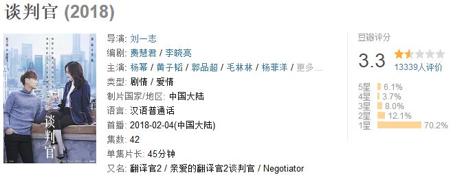自从2月4日播出以来,《谈判官》的csm52城收视率一直维持在1.2%以上,播出前两天也仅仅落后于《恋爱先生》,排在同时段播出的电视剧收视榜单第二位,网播量更是超过10亿,增长速度惊人。但是口碑却只能用“惨淡”来形容。截止到目前,《谈判官》的豆瓣评分仅有3.3分,打一星差评的网友高达70.2%。在豆瓣评分如此惨淡的情况下,这部都市言情剧是如何获得高收视的?想必是很多网友心中的疑问。