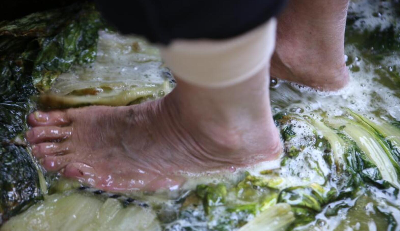 至于做出来的冬腌菜好不好吃,则完全就看踩冬腌菜的人的功夫。一般男人体重大,足底有劲,比女人更适合踩菜。