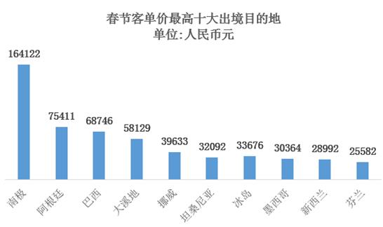 携程旅游统计,春节出境游中,单价最高的十大目的地分别是南极、阿根廷、巴西、大溪地、挪威、坦桑尼亚、冰岛、墨西哥、新西兰、芬兰。春节前往这些目的地的以家庭、情侣居多,全家平均消费可超过10万元。其中春节去南极的游客平均花费最高,达到16万元,但春节在携程报名出游的人数比去年多出一倍。