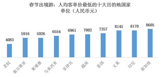 客单价最低的出境游目的地主要在东南亚,人均消费基本在万元以下,包括老挝、塞尔维亚、柬埔寨、马来西亚、菲律宾、越南等,都是单价较低的出境游目的地,其中老挝的春节出境游价格不超过5000元。