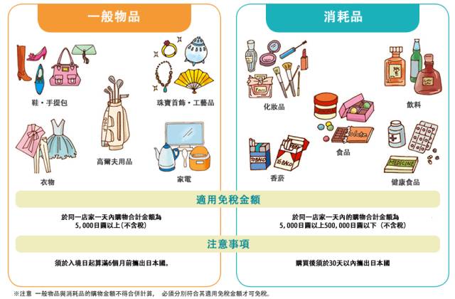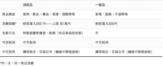 日本退税制度分成消耗品和一般品,这两种有不同的限制,而且还是分开来计算的,具体如下图所示: