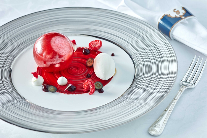 菜色包括北海道海胆配牛油果龙虾啫哩;Kristal鱼子酱配法国带子饺;黑松露煎海鲂鱼;主菜是法国乳鸽伴梨及榛子仁;甜品是红莓脆糖球配杏仁雪糕,最后以咖啡或半岛名茶配四色小甜饼作结。