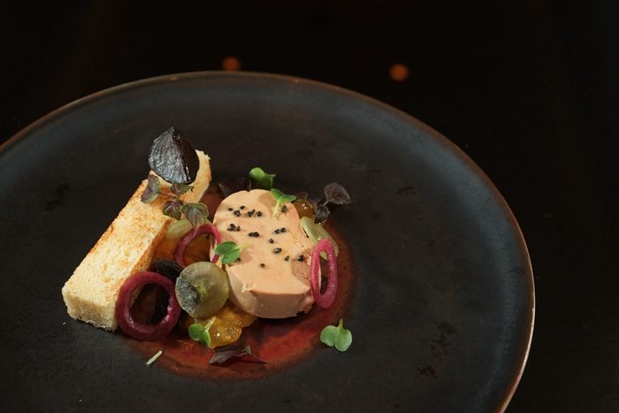 菜色包括北海道刺身带子他他伴鱼子酱配薯片及酸忌廉;煎鸭肝伴鸭肝炖蛋配木梨果酱及黑醋;烧红虾配脆多士配水牛芝士、西红柿及罗勒油;主菜可以选煎烧金目鲷配红酒牛油汁、青豆蓉及碗豆芽或焗和牛牛柳蘑菇批配黑松露汁。