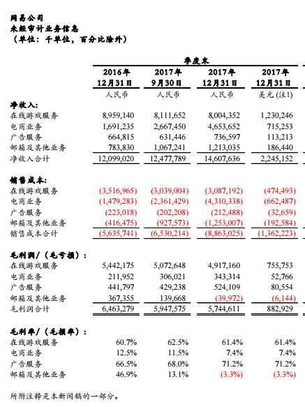 随着近日网易(NASDAQ:NTES)公布2017年第四季度及2017财务年度未经审计财务业绩,可以看到,游戏业务如今已经成为网易保持增长态势的最强劲支柱之一。