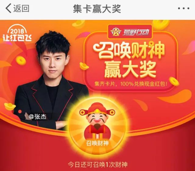 首先从组合模式上来看,微博和央视春晚的结合是“社交+内容”,这也是微博相较于其他玩家的优势所在。微博是国内最大的社交媒体,平台上活跃着众多的明星大V。在春节“让红包飞”活动期间,用户能够在各明星主页领取红包,明星大V们甚至商家们也会积极参与其中,与网友们进行互动。比如2月10日,张杰就联合荒野行动游戏在微博发布了一条短视频,召唤粉丝们集财神卡,兑换现金红包。