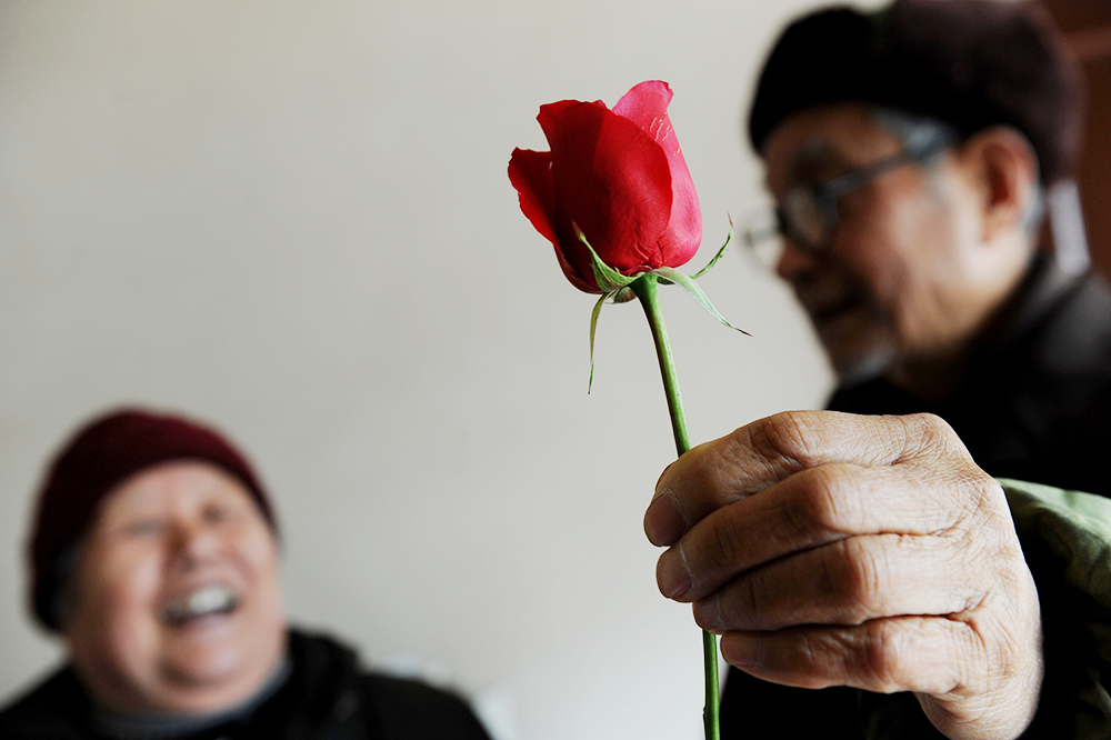 2011年2月14日,合肥,孙爷爷借助手中的玫瑰花向老伴孔令英表达自己心中的那份浓浓的情。