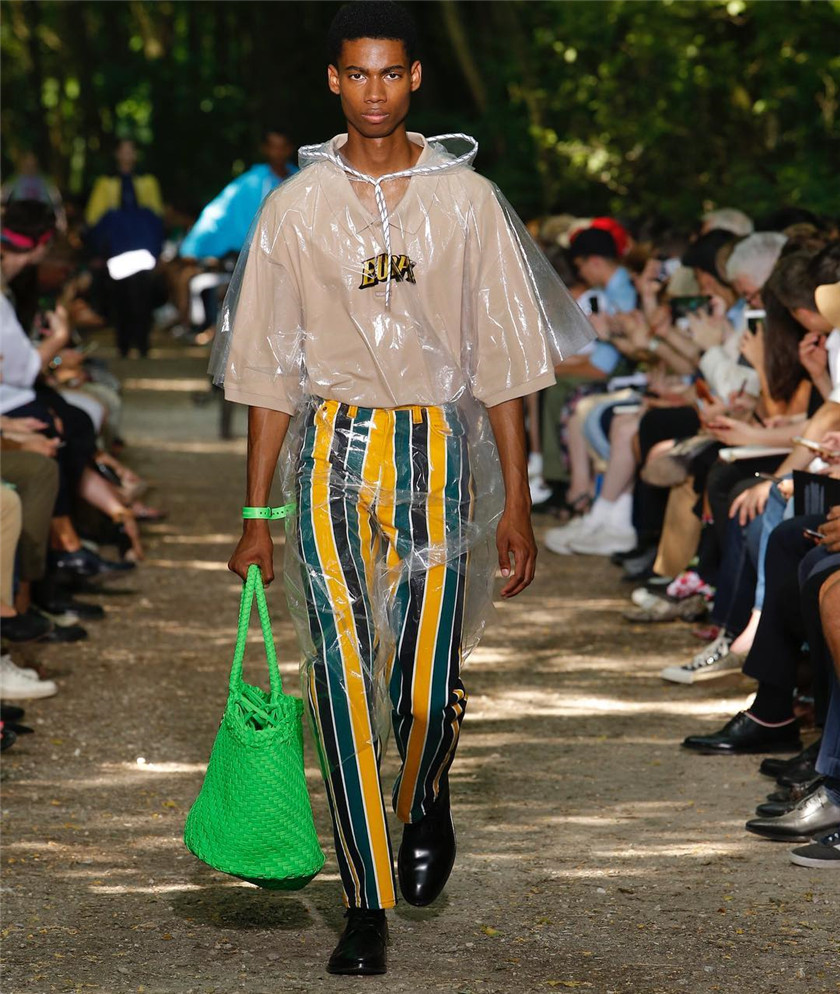 而今年,这种雨衣风潮可能又要开启出一个新的局面。举个例子,巴黎世家在2018年春夏男装周上就推出了一系列搭配透明雨衣,透明材质罩在日常服装上,竟意外的增添了服装的设计感。