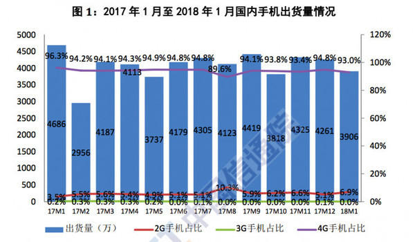 (2017年1月至2018年1月国内手机出货量情况)