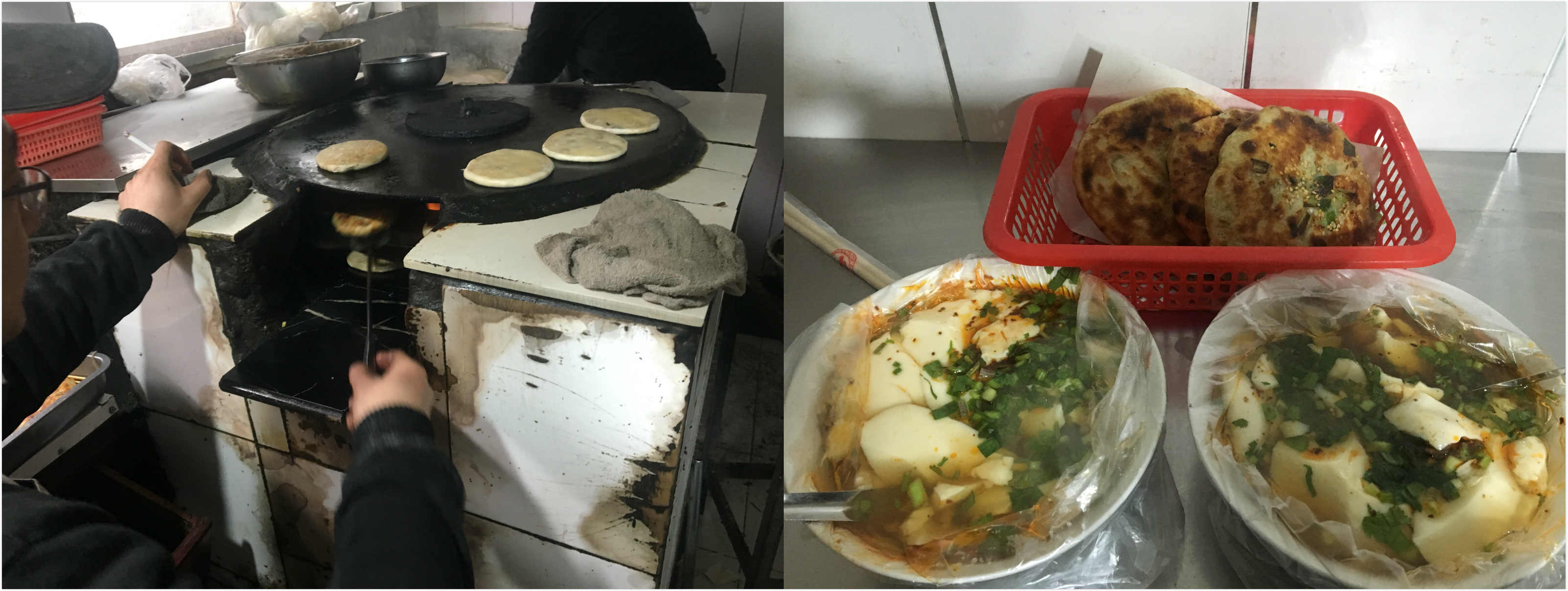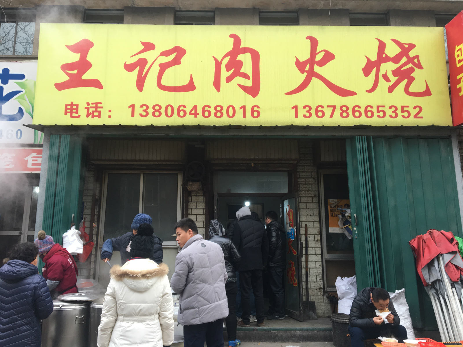 第二天一大早各家就会陆续到达,睡懒觉是绝无可能的,于是便拉上女朋友让她带我去感受了一下当地的本土早餐——潍坊肉火烧,正好他们小区后门外就有一家比较受当地人欢迎的王记火烧铺。周六早上八点半不到门口就有不少人在等新鲜出炉的火烧,让女友先进去坐着找个位子,自己在外面跟着队伍排队。不过老乡们都是见缝插针,导致我前面的人是越排越多。这时女友作为不会说当地方言的本地人忍不住把我拉了进去,原来这里都是直接从里面炉边师傅那里点餐就行。