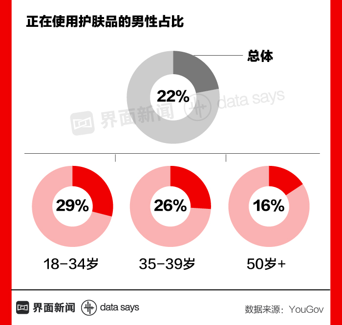 舆观调查网YouGov在2017年发布的调研结果显示,护肤品已经不再是女性的专利,男性也开始越来越重视个人皮肤护理。1/3的男性消费者表示,使用美容产品能让他们看起来更好。1/4的受访者表示,使用护肤产品可以防止老化。