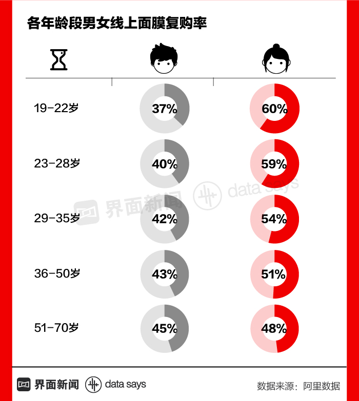 网购数据也映证了这一趋势。阿里数据显示,随着年龄的增加,女性的面膜复购率逐渐下降,男性的面膜复购率则逐步攀升,51-70岁的男性消费者的面膜复购率达到了45%,只比同龄女性低3个百分点。