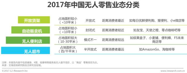 从形态上看,1)自动贩卖机出现的时间较早,目前覆盖的品类也较多。主要以标准化产品为主,国内典型企业如友宝,主要放置在楼宇公共区域等半封闭式场景。2)开放货架出现相对较晚。2016年8月,小e微店在全国已经布下了1500多个网点。目前市场上也推出了大量的开放货架产品,主要放置在企业内部的封闭式场景。3)无人店类似于小超市或者便利店,主要是2016年12月之后开始迅速爆发,虽然之前也有企业开始耕耘无人零售,但市场的火热以国外的Amazon Go和国内的淘咖啡为起点和引爆点,巨头的行动带动了整体市场的快速推进。本报告盈亏平衡点、投资回报周期等财务测算部分以无人便利店作为研究对象,但市场规模包括开放货架、自动贩卖机和无人便利店三类。