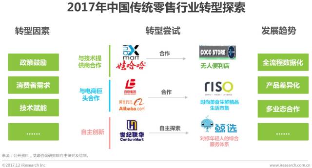 面对中国经济结构的调整加快,消费者诉求在电子商务、移动支付的普及以及智能技术发展的推动下,传统零售企业也在不断尝试着转型升级,主要包括三种转型模式:1)与技术提供商合作开发,如哇哈哈快猫合作的无人便利店;2)与电商巨头合作创建新型零售生态,如百联集团与阿里巴巴合作的针对中高等收入人群的精选超市;3)自主创新探索新增长点,如世纪联华的对标年轻人综合消费的鲸选APP。艾瑞咨询认为,传统零售全流程数据化、产品差异化、多业态合作等将会成为新的竞争要素。