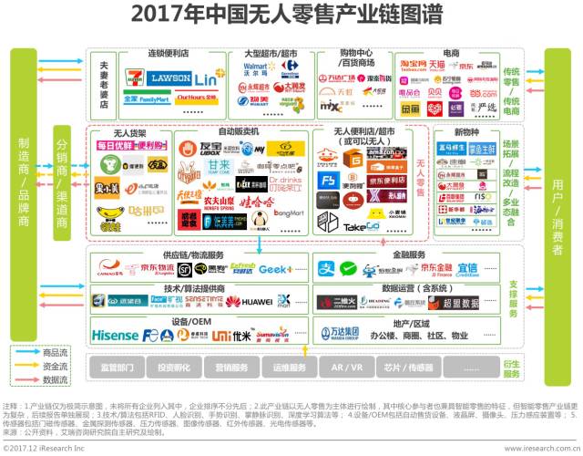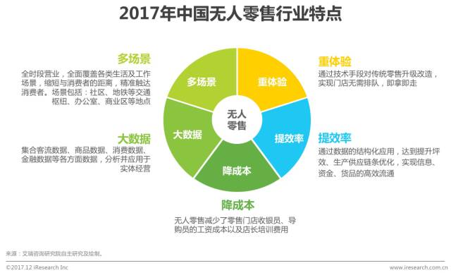 当前中国无人零售行业主要呈现五大特点:以降低人工成本作为无人零售的主要切入点,在重视消费体验,拓展零售场景的同时通过多种技术手段实现大数据的收集、分析与应用,并最终实现消费流程的全面数据化以及整个产业链的智能化升级提效。艾瑞分析认为,零售产业链的全面数据化才是无人零售背后的战略核心,包括客流数据、商品数据、消费数据、金融数据等的全面融合与应用。