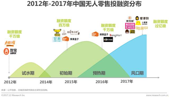 从自动贩卖机、开放货架与无人店这三个赛道整体来看,2017年无人零售的融资金额总量较大,资本市场对无人赛道有所青睐,推动了国内无人零售市场发展的进程。1)自动贩卖机有7家企业进入A轮(及A轮之后)融资,除友宝一家已上市企业外,还有天使之橙、饭美美、甘来等。2)无人货架有8家企业进入A轮(及A轮之后)融资,包括每日优鲜便利购、领蛙、小e微店、哈米等。3)无人便利店有4家企业,分别是便利蜂、F5未来超市、缤果盒子和小麦铺,相较于另外两个赛道来看,都处于融资初期轮次。更多融资信息参见附录。