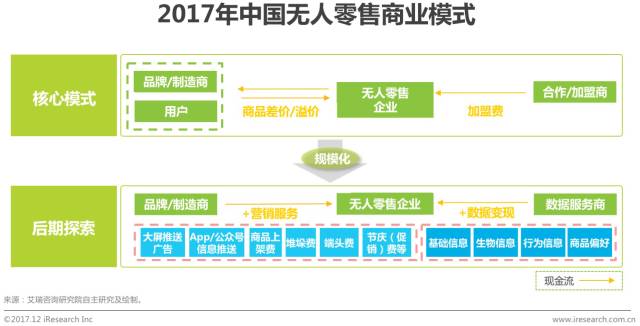 艾瑞咨询认为,初期无人零售运营商需要提升议价能力,如规模化对上游压价,降低进价以提升商品溢价;从长期来看只有实现规模化,运营商才能获取更多广告收入并实现数据的变现。目前来看运营商规模化的方式主要有两种:1. 大规模的自营,需要大量的资本投入;2. 大力发展加盟模式,需要更强的管理运营能力。