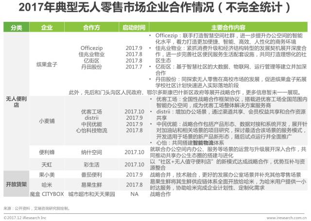 目前无人零售市场中已出现企业间合作与合并的现象。企业合作多集中于供应链/物流、商业地产和社区等,对无人零售企业来说资源优化配置,形成稳定的经营模式,必不可少。兼并收购可使无人零售企业优势互补,有利于双方的场景扩充,技术升级等,目前仅发生一例由果小美和番茄便利的战略合并。