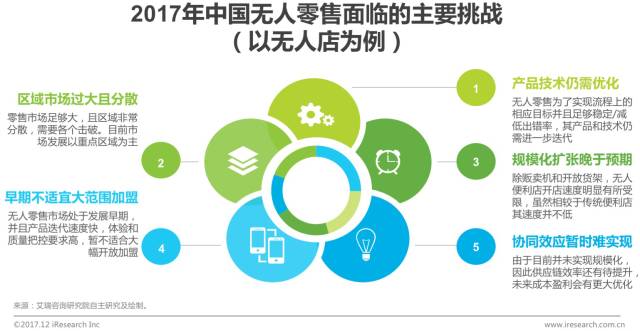 基于报告前面各章节的内容,艾瑞咨询分析认为,典型优质企业能够起到很好的示范作用,整体无人零售市场有发展前景。但目前来看,不容忽视的是市场刚刚经历一年左右的发展,还处于前期探索阶段,因此还存在一些比较共性的发展困阻,主要集中在产品技术优化、区域市场拓展、企业规模化发展、企业开放加盟和供应链的协同效应。