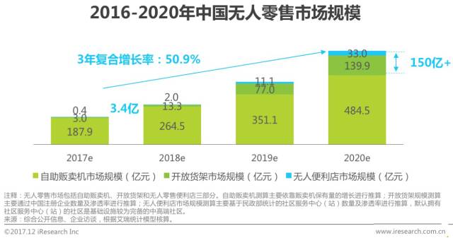 艾瑞咨询最新统计数据,2017年无人零售市场(含贩卖机)交易规模保守估计将接近200亿元,预计2020年将突破650亿,三年复合增长率在50%左右。