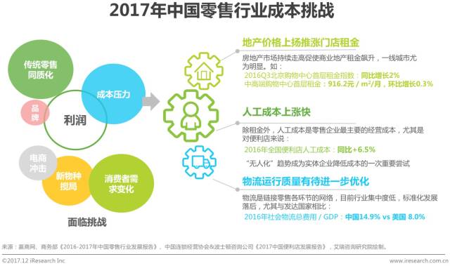 原本竞争激烈的传统线下零售,由于国内电子商务蓬勃的发展和市场新进者(新物种)的涌现,给资产厚重的实体零售企业带来了更大的冲击。在线上线下产品、价格差异不断缩小,并且租金、人工、物流等成本居高不下的情况下,最终零售业态若要实现利润空间的提升,成本效率和用户体验将亟待优化。