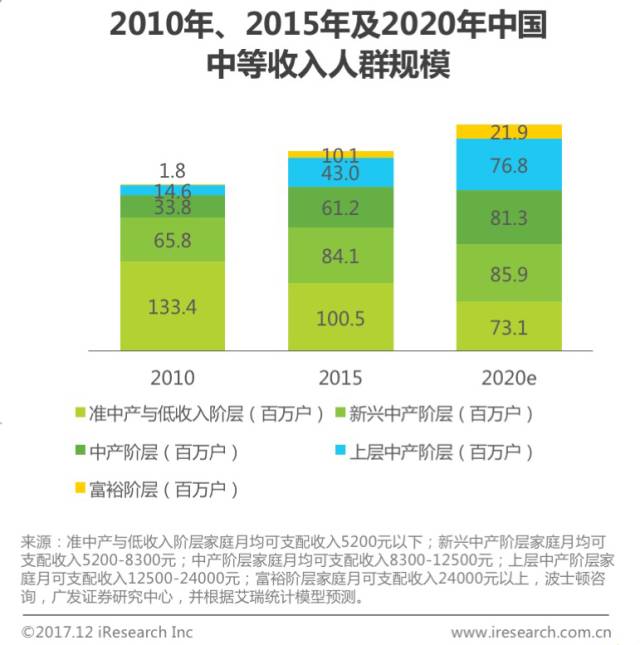 消费者是产品和服务的使用者,如何获取消费者“芳心”成了时下零售参与者最关心的问题。一方面,在第六次人口普查中,80、90后人群约占30.6%,年龄分布在11-30岁之间,2017年这批人群年龄分布在18-37岁之间,是消费领域的主力军。另一方面,中等收入人群持续扩大。艾瑞咨询认为,预计到2020年,月可支配收入在8300-24000元之间的中等收入人群将达到1.58亿户,较2015年增长53.9%。