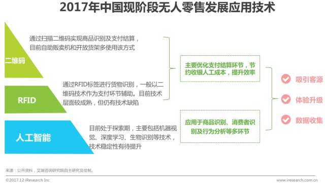 智能技术的发展是零售行业升级转型的重要推动力,目前市场中的技术流派主要分为三种:二维码技术、RFID标签识别技术以及人工智能。二维码及RFID技术主要应用于支付结算环节,优化收银环节人工成本和结算效率,但随着人工智能技术的不断完善及多环节应用,未来将会成为主流技术,带来更佳的消费体验。