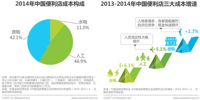 参考中国连锁经营协会关于便利店的公开数据,2014年中国便利店销售额增长3.8%,毛利增长2.2%,而同期人工成本增长5.1%,毛利与销售额、房租的增长率相比明显较低,说明主营业务成本增长较快,导致企业毛利空间被压缩。传统便利店面临两高一低(房租成本高、人工成本高、毛利空间持续下降)的问题。如报告前文所述,2016年最新数据显示,便利店租金上涨7.0%,与2014年相比房租上涨明显,未来仍将保持此态势。