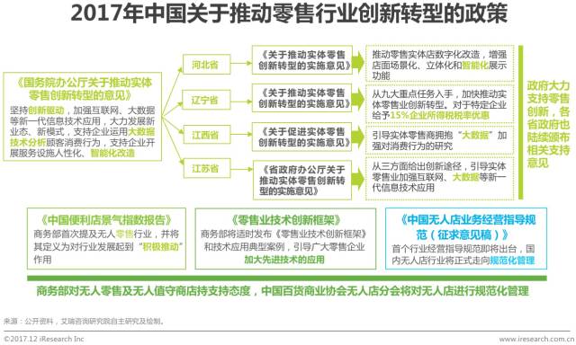 国务院及各省政府均出台相应意见支持实体零售创新转型,尤其看重创新技术在推动传统零售创新转型上的作用。而无人零售作为零售创新业态获得了商务部的密切关注。艾瑞咨询认为,当前政策依然会保持鼓励支持的态度,支持行业的转型和业态的创新。