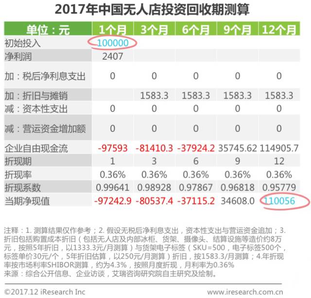 以15平方米,采用RFID技术的无人便利店为例,单个门店日销售额达到每天800左右元时可实现盈亏平衡,此时坪效为2.0万元/平米/年,约为小型超市(2016年红旗连锁平效1.2万元/平米/年)的两倍,当然,由于模式间差异较大,坪效不具有直接对比的意义。在无追加投资的情况下,从第8个月起无人店开始为投资者带来价值,回收初始投资约需一年(典型无人便利店企业投入均在10万元左右,回本周期10-14个月不等)。艾瑞咨询认为,以项目期60个月(5年)来看,无人店项目投资回收时间相对较快,约为总项目期的五分之一,项目有一定的投资潜力。