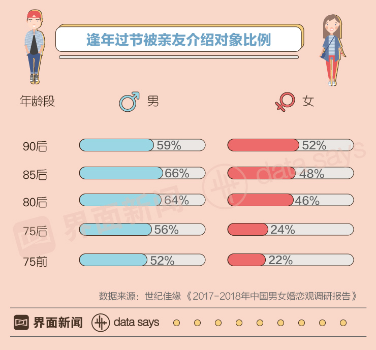 根据世纪佳缘对其会员进行的调查,“85后”男性和“90后”女性是如今被催婚催得最厉害的人群,逢年过节就会被各方亲友介绍对象。此外,40岁左右的男性被介绍对象的比例也很高,超过50%,同年龄段的女性则只有两成。