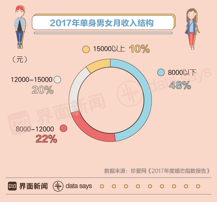 珍爱网曾在2016年发布的《单身人群现状报告》中提到,超八成单身女性认为5000元是男性收入的起点,1/4的单身女性要求自己的未来伴侣收入过万元。