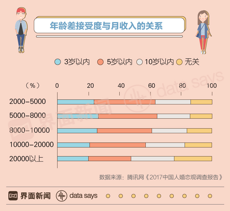 有意思的是,人的收入越高,对5岁以内的年龄差的接受度就越低,对10岁以内年龄差的接受度就越高。尤其是当月收入达到2万元时,认为年龄差无关紧要的比例骤然增多。