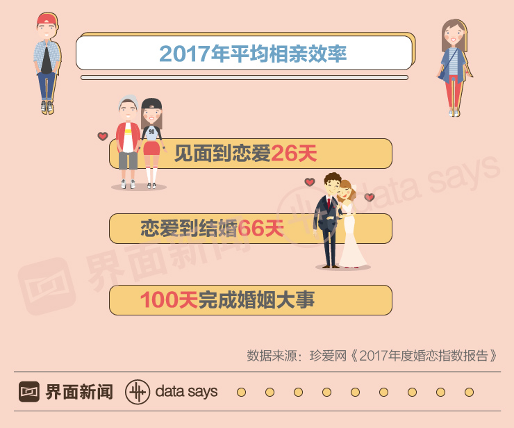 根据珍爱网的统计,在亲友和婚恋网站的“助攻”下,相亲正在变得越来越“高效”。2017年,相亲男女从初次见面到确定恋爱关系,平均花费一个月,从恋爱到结婚平均花两个多月。