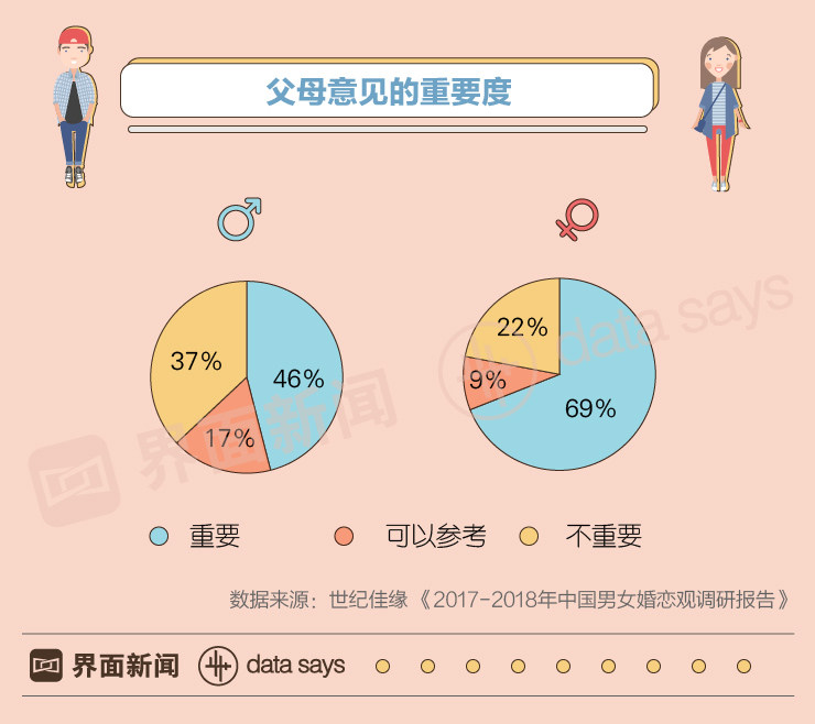 当相亲对象的各方面条件都已满足自己的要求时,近七成的女性会去征求父母的意见,并把他们的意见摆在十分重要的位置。此外,只有不到一半的男性认为父母的意见很重要,近四成认为不重要。