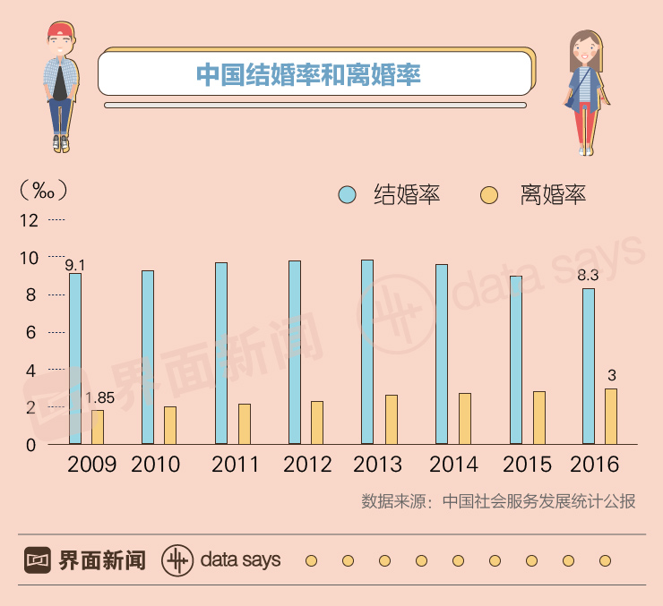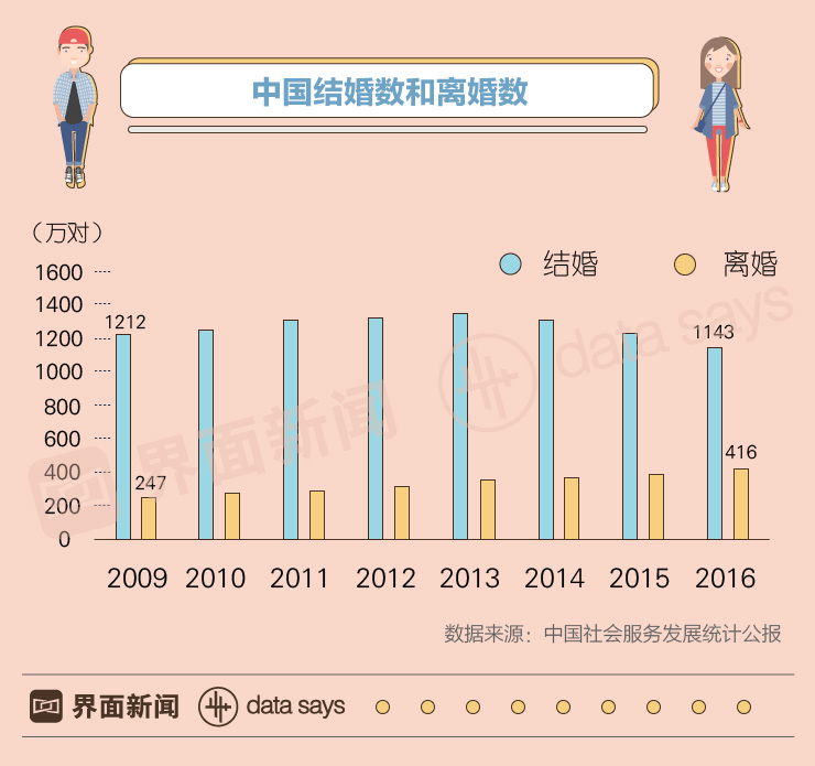 民政部数据显示,2016年各级民政部门和婚姻登记机构共依法办理结婚登记1142.8万对,比上年下降6.7%,结婚率已跌至8.3‰;依法办理离婚手续的共有415.8万对,比上年增长8.3%,离婚率又创新高。