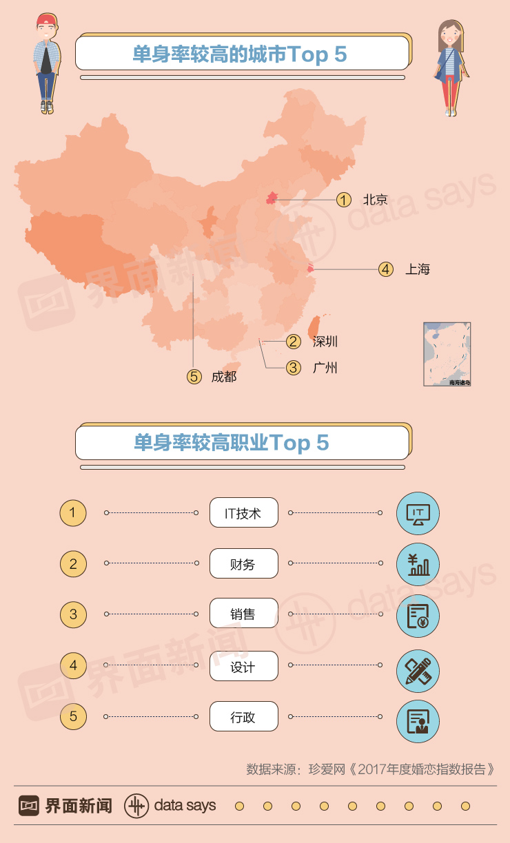 从地域和职业来看,北京、深圳、广州、上海和成都是单身率最高的城市,IT、财务和销售则是单身率最高的职业。