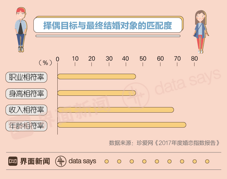 然而,珍爱网统计数据显示,择偶目标与最终结婚对象的职业相符率只有45.6%,是所有统计项目中最低的。匹配度最高的项目是年龄和收入。
